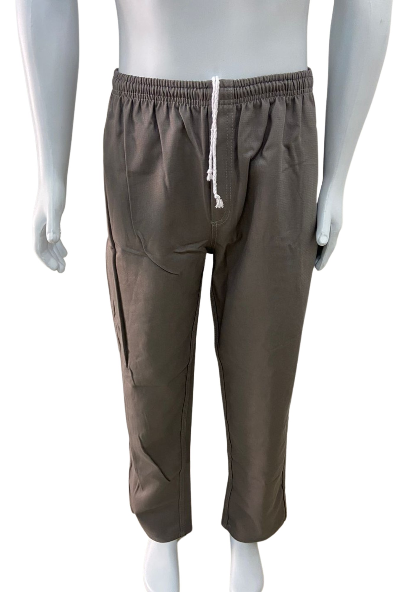 Calça de elástico confeccionada em tecido Brim com modelagem unissex. Dois bolsos laterais embutidos do próprio tecido e um bolso na parte de trás. Elástico em todo o cós e com cadarço interno.