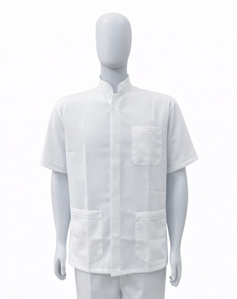 • Jaleco curto confeccionada em tecido Oxford com modelagem tradicional e unissex. Com três bolsos frontais, gola padre e fechamento por botões na parte frontal.