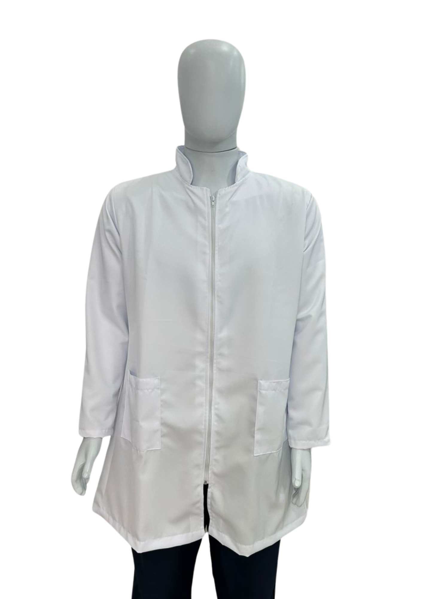 • Jaleco confeccionada em tecido Gabardine com modelagem unissex ajustada ao corpo, modelo manga longa com elástico no punho. Dois bolsos frontais, gola padre e fechamento em zíper.